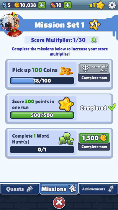 倍速是通过mission(任务)来增加的,共有30个任务,每个任务一倍速度,全部完成后获得30倍速,之前自己也不知道有mission存在,速度始终在6、7倍徘徊,相同的米数,得分却要差很多。可以 说,游戏伊始,第一件要做的是就是完成30个任务。有些任务难度较大或者需要几天来完成,这时就可以在shop里,通过金币来跳过任务。