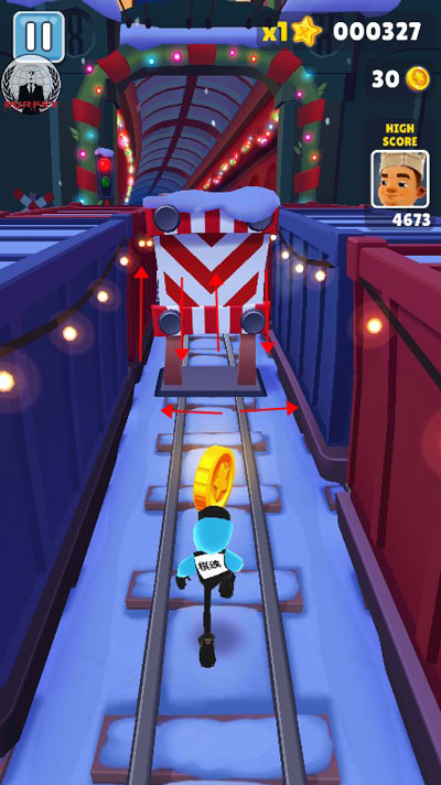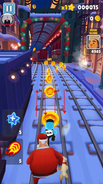 通过双击屏幕来启动滑板,滑板会持续一段时间。在没有滑板的情况下,角色撞到火车或者障碍等都会被警察抓住,游戏终结。但在有滑板的状态下,角色就有了一道保险,撞到火车等的时候,滑板会消失,游戏可以继续进行。