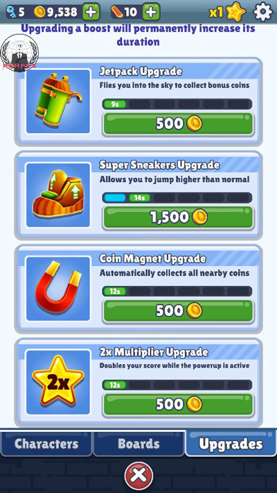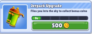 通过金币购买,可以升级道具,使得道具的持续时间更久。升级路线可以按照自己喜好来,不过推荐优先升满喷气背包。