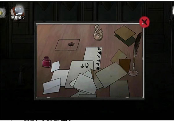 2、桌子上得到【入院通知】【羽毛笔】【字符线索】和变形物天鹅摆设),用羽毛笔沾取红色墨水后,插入中庭尖刺旁边有羽毛形状的洞中,得到【剑徽章】