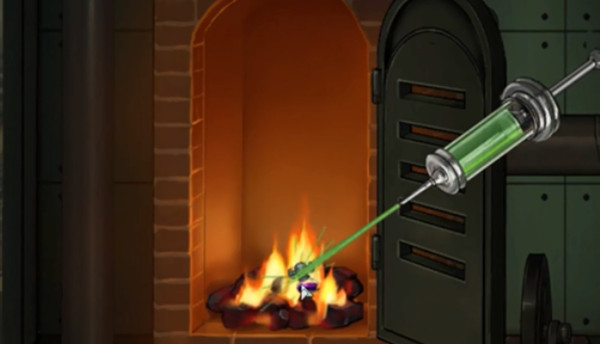 前往治疗室,对边上火炉点击放大后打开门,使用装满水的针筒,灭掉火之后得到【紫红色液体】和【煤炭】。