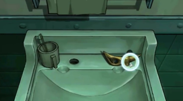 点击洗手台,取得铜制碎块,且知道缺少水龙头。
