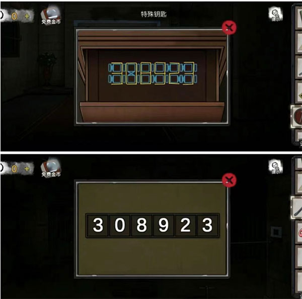 11、牢房左侧墙上的密码锁通过房间抽屉中的数字线索解开(308923),如图⑥,得到【容器】