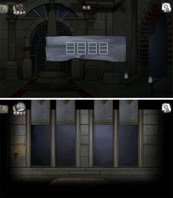 12、右侧墙上进行游戏,将物体与轮廓重合,(记得点击右侧按钮旋转物体),看到金属的拉环,用麻绳连接拉环和柱子,转动打开牢房门