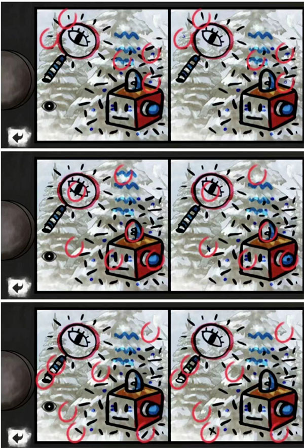 继续右滑,到来这个场景,此处有多个机关需要玩家解密。把红色的按钮放置到钟表机关缺失的地方,发现还缺少一根指针。