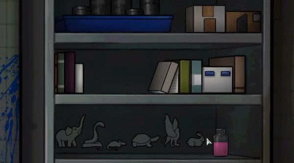 把星形木块放置到钟表机关下面的柜子上,打开后获得把手。回到地下室,挪开左边的地毯,看到暗门。放上把手和螺丝,并用螺丝刀拧好,之后即可开启。从中取得巨型针筒。