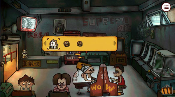 10、成功进入电玩店后,和白衣服小胖子聊天,把纹身店拿到的手表给他,捡起他掉的电影票,然后玩他旁边的游戏机器,解开机关完成游戏后得到蓝球,和老板换钱