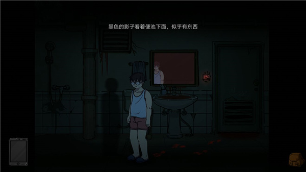 来到门口,点击门口,发现门后有白发老奶奶,关灯,来到蹲便的位置,出现黑影,盯着蹲便观看,