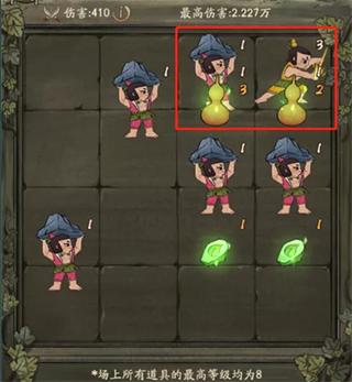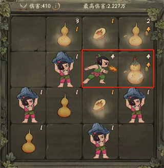 ③进阶技巧技术高强的掌柜,可以挑战控制尽量多个葫芦娃同时攻击,单回合攻击的葫芦娃越多,伤害提升越多;