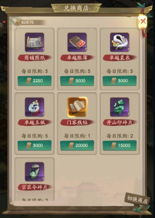 乔迁商店是门客突破道具的主要来源,建议掌柜持续购买卓越账薄和卓越裘衣。玉佩乔迁商店买即可,接下来是算盘,人参,和商铺图纸这三个。具体优先级主要看掌柜准备冲什么榜,需要看个人需求。