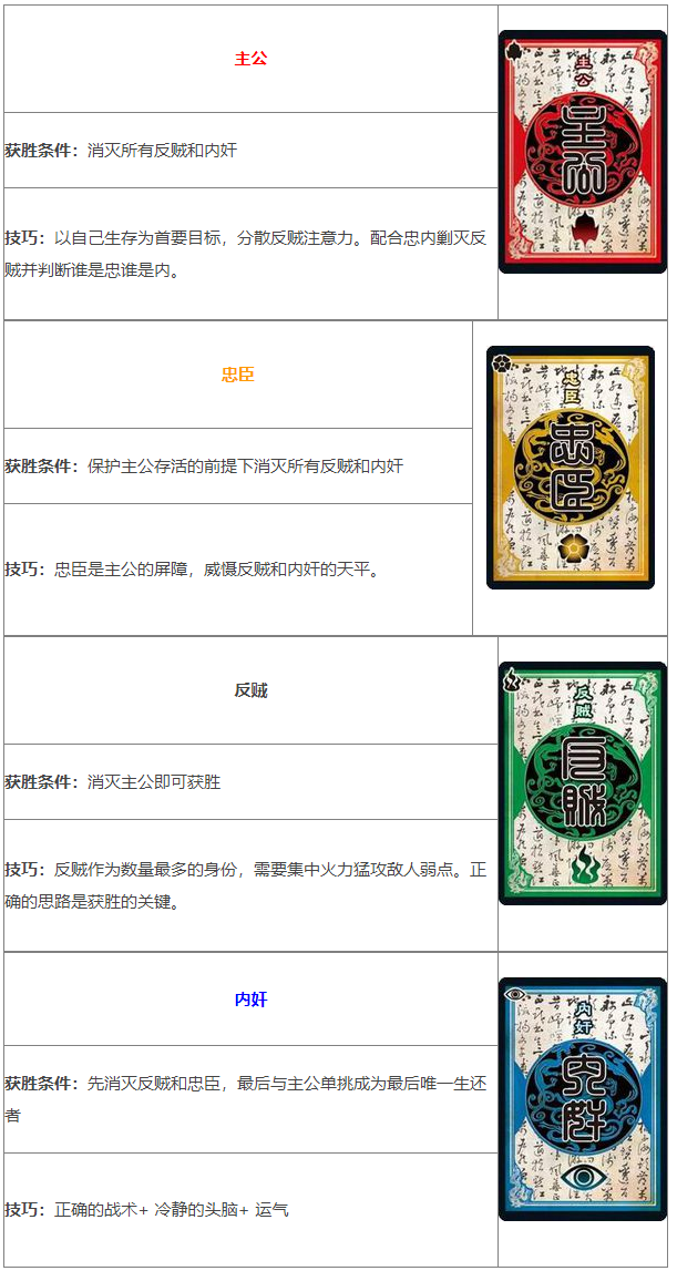开局随机分配4 大身份。除主公外,其他忠臣、反贼和内奸身份暗置,靠玩家表现来体现身份。隐藏自己,寻找同伴都需要经验累积。(例如一心想消灭主公和忠臣的反贼,保护主公的忠臣,想消灭所有人的内奸)
