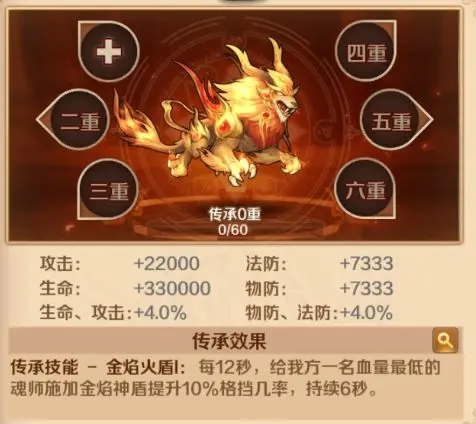 ④传承:魂灵传承的提升是需要消耗S级魂灵的碎片的,而且一共是有6重的的传承,每次升级传承效果可以提升魂灵的传承技能,提升得越多,魂灵的传承技能还会增加额外的效果。