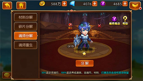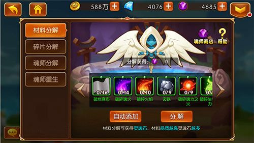 重生天使系统也很实用,通过分解材料、碎片或魂师,可以获取大量英雄粉尘,用于购买更好的英雄碎片。虽然前期可能觉得分解有点浪费,但到了中后期,确实能帮玩家更快提升实力。