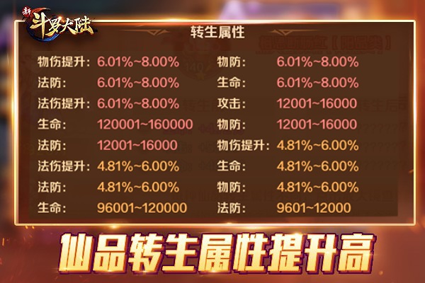 SS仙品转生属性多出了红色,但转生属性的具体类型没有发生改变,有所变化的是属性上限从6%提升到了8%。