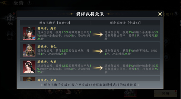 武将和坐骑都是有【羁绊】设定的,搭配合理的话,可以大大提升战斗力。
