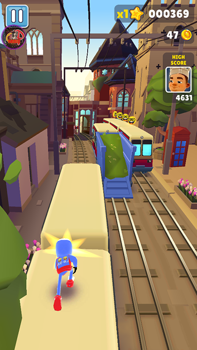 玩家经常遇到的一种情况。左右两路没有任何障碍,中路有5~6辆火车奔过来。为了能够把车上的金币吸收干净,这个时候就可以运用基础组合跳滚了,前提是不要玩得太很,稳一些较好,如果火车还没到达玩家下方,玩家就已经在半空中往下划那么就只有死翘翘了。