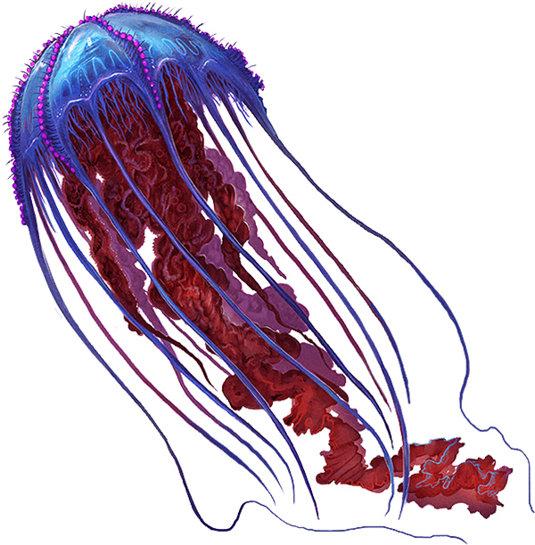 钵水母拥有多种水母的特征,继承了大型蛋黄水母的体型和形态,箱形水母的强力针刺,以及深海水母的生物发光特性。这一切结合而成了一种照亮海洋最深处的危险生物。