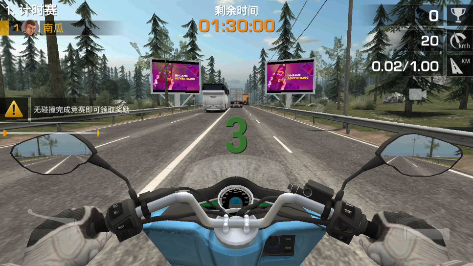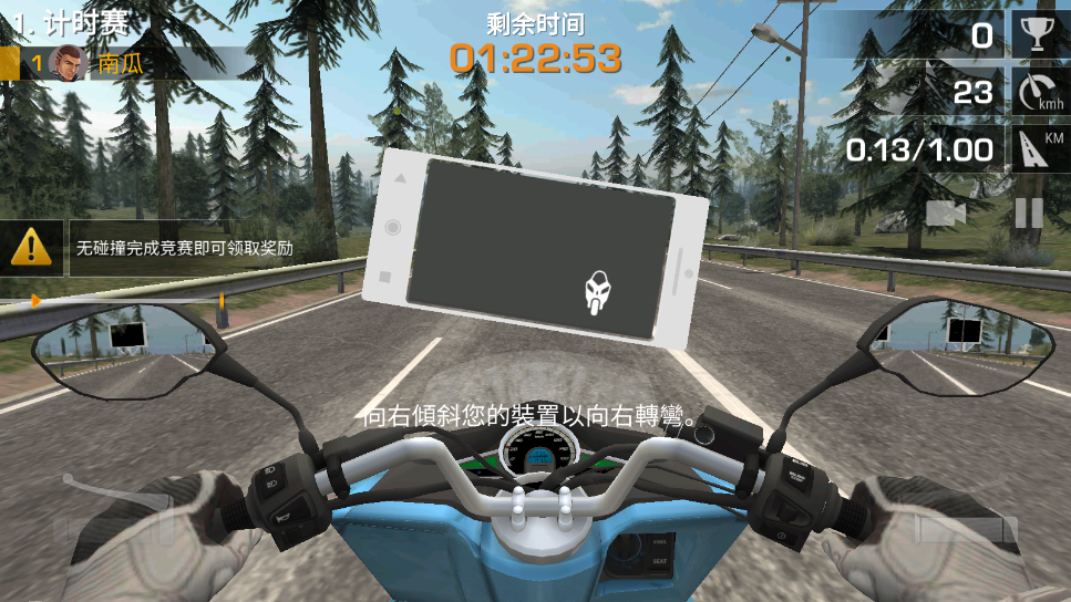 3、左边是刹车,右边是油门,通过倾斜手机来控制摩托车的方位,如果是向左倾斜,摩托车就会网左边走,反之则向右边;
