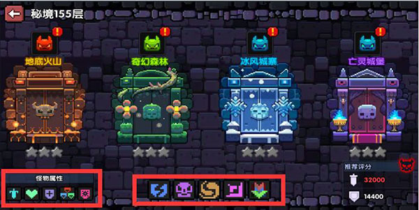 每层的关卡选择属性图时,会显示当前关卡层数的怪物信息以及对应词条buff,大家进入秘境时一定要仔细查看哦!左下角的怪物属性可以查看怪物的护甲值和抗暴值,玩家可以配备对应的护甲穿透以及暴击值进行秘境挑战!