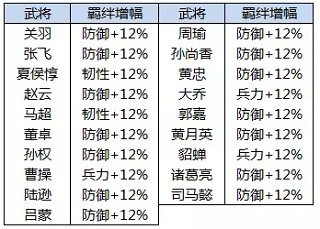 特点:羁绊组合加成也很高,要求相对低,只需要两个将领便可达成,属于防御型羁绊。