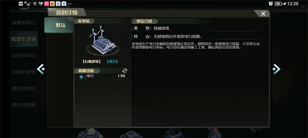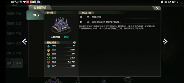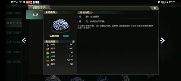 所有建筑都是Ill级甲(也就是游戏中的重型装甲)为了方便,游戏中的补给点统一都用(钱/资源)来表示,电力用(度)来表示,耐久用(生命/血)来表示