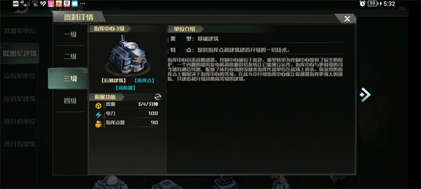 其他建筑生命值普遍偏少的反抗军都指挥中心却在1到3本比其他两个阵营要多,分别为:1本19100血,94甲、2本24600血,99甲、3本29860血,104甲