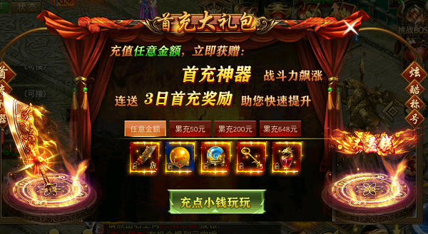 游戏内首充大礼,充值任意金额即可领取!神兵利器,炫酷称号,稀有材料应有尽有!投资理财,五倍受益,0元礼包赠送装备特戒!购买每日返还元宝,七日全返还!游戏特权卡,千万不要直接购买激活,累充200元可以免费激活特权!属性叠加,特殊称号,还有大量绑元和金币,千万不要错过!