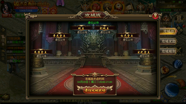 王城争霸玩法区服内所有公会皆可参与活动,活动开启10分钟之后,皇宫内仅剩一个行会可以暂时获得王城归属,21:00活动结束后皇宫内获得归属行会成为真正的霸主公会!公会会长和公会成员将会获得海量奖励!