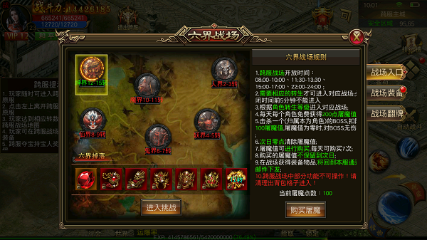跨服战场由开服第四天开启,玩家需要进入跨服主城点击跨服战场NPC进入。分别分为人界,妖界,鬼界,魔界,仙界,神界六个战场,不同战场需要的转生等级也不一样,需要注意的是战场关闭前五分钟不能进入!和公会兄弟一起讨伐吧!跨服战场每天免费获得200屠魔值,击杀BOSS会扣除屠魔值100,击杀BOSS还可以免费获得翻牌次数!战场掉落专属战场装备,只有六界战场才能掉落。