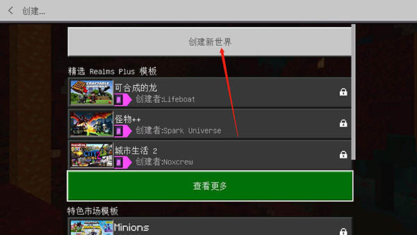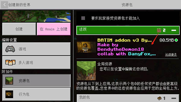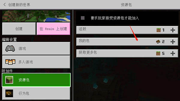 4、进入创建新世界界面,在左下角-附加件中点击“资源包”;