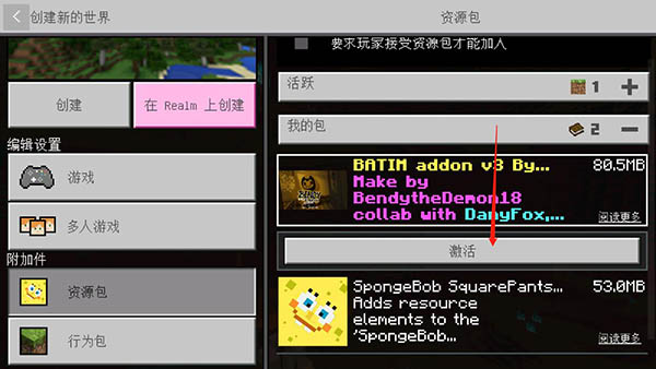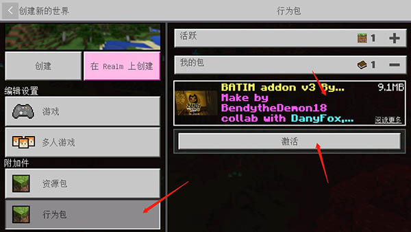 8、再点击附加件中的“行为包”,点击班迪与墨水机器模组后点击激活;