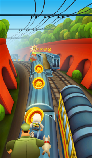 地铁跑酷国服是一款全球经典跑酷游戏,以铁路为背景,游戏主线从三条铁轨上展开,玩家要以孩子Jake的身份不断在铁轨中穿梭来躲避列车,同时收集金币,躲避警察及猎狗的追捕。玩家在躲避障碍物及警察的同时,尽可能多的获取金币,当用户获得一定数量的金币后,可以购买道具及人物。同时地铁跑酷中有磁铁、飞行背包、双倍得分、运动鞋、滑板等道具,可以帮助玩家获得更高的分数。