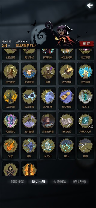 装备牌:初始装备魔力法杖(恢复2点法力造成1点伤害)1到2个,根据你的装备槽决定,开启城堡资料片后送的女巫扫帚(在第二幕开头送,用两张法力牌随机得一张咒术牌)1个。