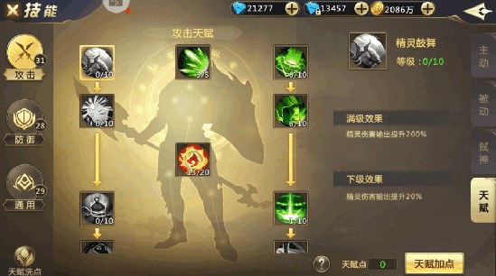 天赋技能分为攻击,防御和通用,玩家每升一级会增加一点天赋点,用于学习天赋技能,目前有三种流派加点推荐。