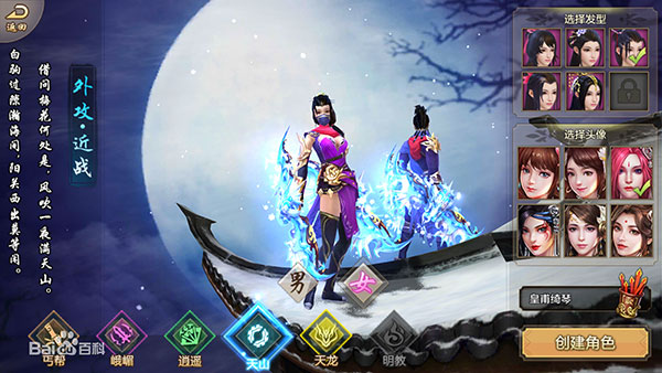 游戏门派共有5个,分别是逍遥、峨嵋、天山、丐帮、天龙,每个职业都各具特色。玩家在创建门派时,可选择男、女任意一种性别,而且每个门派还提供不同的头像和发型选择。