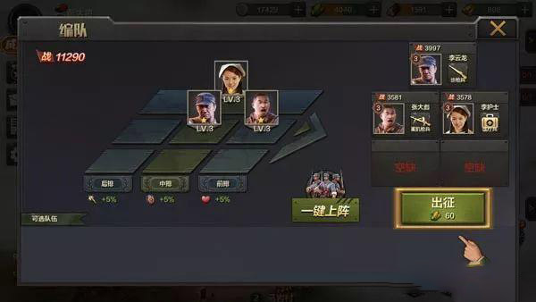 2、战场配置~不同的将领有不同的指挥特长,李云龙团长作为步枪兵的核心将领,擅长在前排冲锋,李护士作为医疗部队,适合围绕在步兵团队附近快速的为团队进行医疗。一场战斗中可以同时上阵5名将领,因此战场上将领配置是制胜关键!