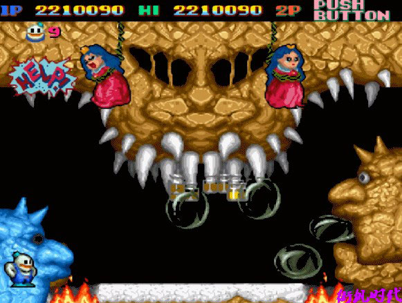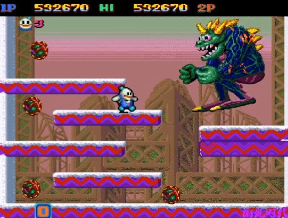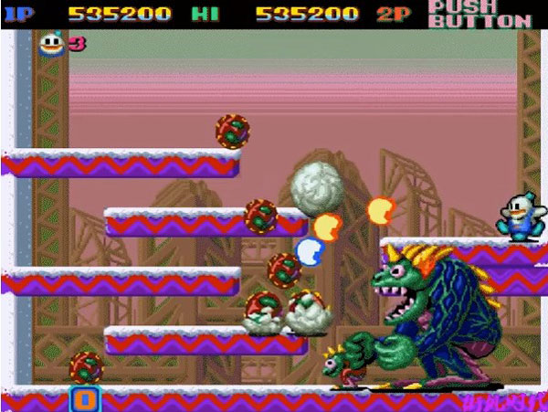 3、《雪人兄弟》有一个比较有意思的设定,玩家只要能够坚持一段时间就可以直接过关,BOSS打不打死都无所谓。小编尝试过在不清敌兵的情况下,直接跳到BOSS背后使用普通攻击。然而一直拖到过关BOSS都没有被打死,也就是说BOSS很有可能是无法使用子弹打死的。但真的是这样吗?
