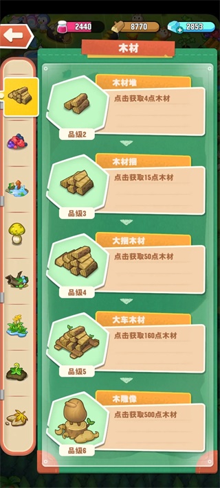 木头能买建筑,升级仓库,提高木材和果酱的上限,神秘商店也能买东西,果酱能买动物抱枕,去旅游。前期建议肝木头和果酱。