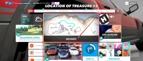 2、进入世界地图,寻找财富岛宝藏2,选择获取财富岛宝藏2路线,再查看比赛用 的车型。