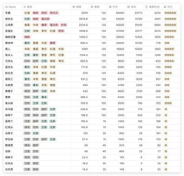 一方面,人物每餐价格、成本会巨幅波动,我没体现在表格内。