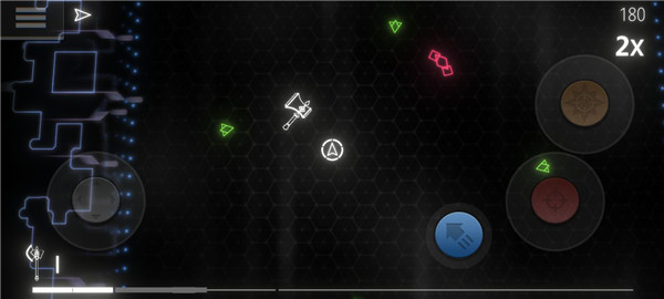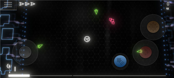3、游戏采用了双摇杆操作模式,这里你只需要闪转腾挪,在几十种不同的敌人类型当中任意的砍杀、碾压,感受爆炸的指尖操作,最终杀出敌阵即可获得高分。