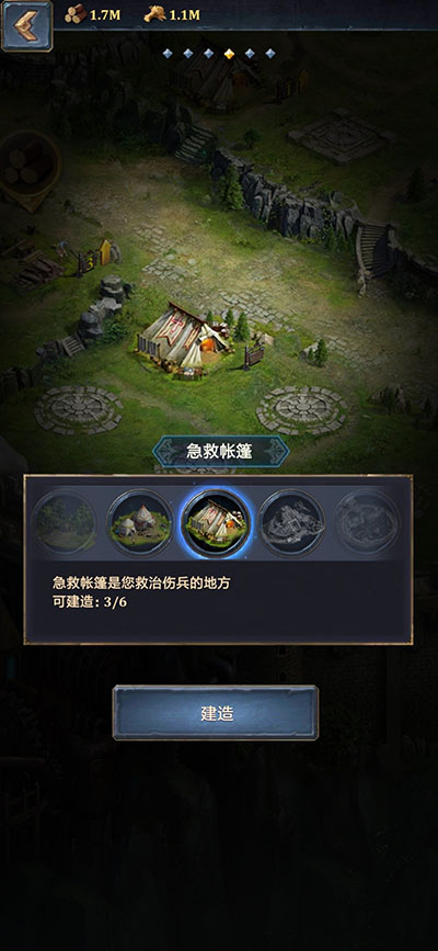 当玩家开启讨伐系统后就可以多建造行军帐篷和急救帐篷,这两个建筑是军事区建筑建造和升级的前提条件,同时可以缩短小兵训练时间。在游戏进度推进到后期后,就应该建筑和升级铁矿厂和秘银矿场,这两个建筑产出的资源在游戏后期极为重要。