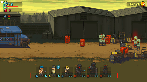 从玩法来说本作属于对推式塔防,别看校车不大,里边可是装着很多人呢。与其他对推式塔防游戏一样,我们需要攒够一定的能量,如图左上角蓝色和红色的能量,蓝色的可以召唤作战单位,比如平民,猎人,工程师等等,红色的则可以释放技能,达到一百还有意想不到刺激噢。