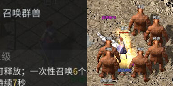 召唤群兽:道士的蓄能技能之一,,需要等待能量缓慢积蓄完成后才能使用。消耗所有能量,发出远古的呼唤,瞬间召唤大批神兽加入战场,配合原本的神兽和灵兽,一人指挥千军万马,荡平所过之处,气势十足。