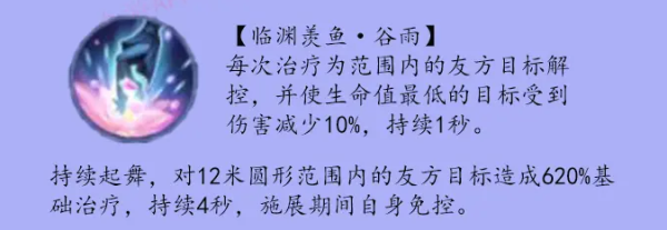 点评:这个技能很流弊,可为范围友军解控还能减伤,还能大量回血,其次释放的时候还能免控,大大的缓解了队伍的生存环境,和自身的功能性。