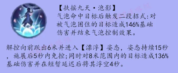 ②逍遥:【漂浮】姿态下自身造成的伤害和治疗效果提高9%且不会受到减速的影响。