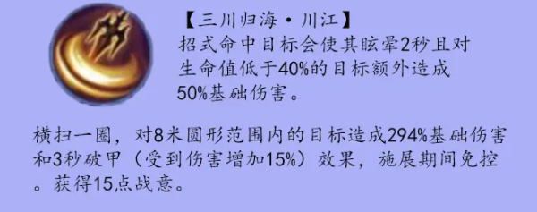 点评:破甲加伤害,还能眩晕敌人,并且对于生命值低于40%的敌人会造成额外的伤害,因此也决定了本技能一般用于技能连接的中段或者尾段,开启战意状态小怪更佳。