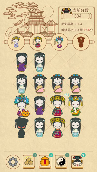 4、手指简单的点击或滑动屏幕,即可将相同等级的宫廷软妹聚在一起,初入宫闱的小秀女将一个一个地在你的指尖成长为一代皇后。