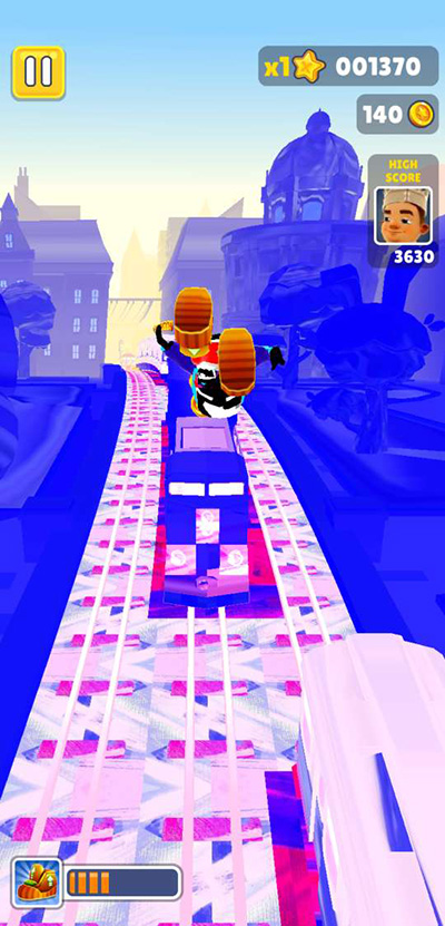 获得飞行背包(Jetpack)后,在道具有效时间内,可在空中飞行,不会遇到障碍物及火车,但仍然可收集金币。