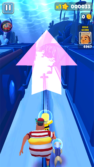 1、划屏控制方向。和所有跑酷游戏类似,玩家左右划屏控制游戏角色左右移动,上划跳跃,下划蹲曲,比较有意思的是主角在空中的时候也可以左右控制方向。